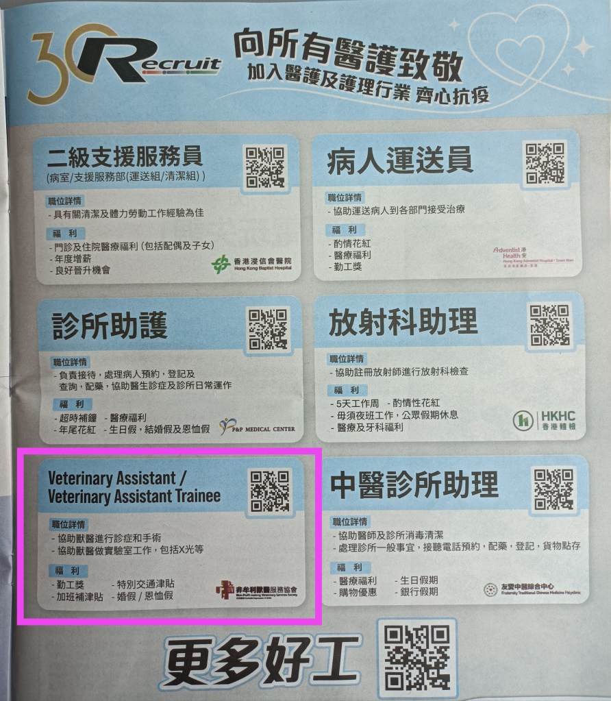 The Hong Kong Non-Profit Making Veterinary Clinic’s recruitment advertisement (See the purple squared zone, Subscripted from《Recruit》issued in March 4th, 2022)