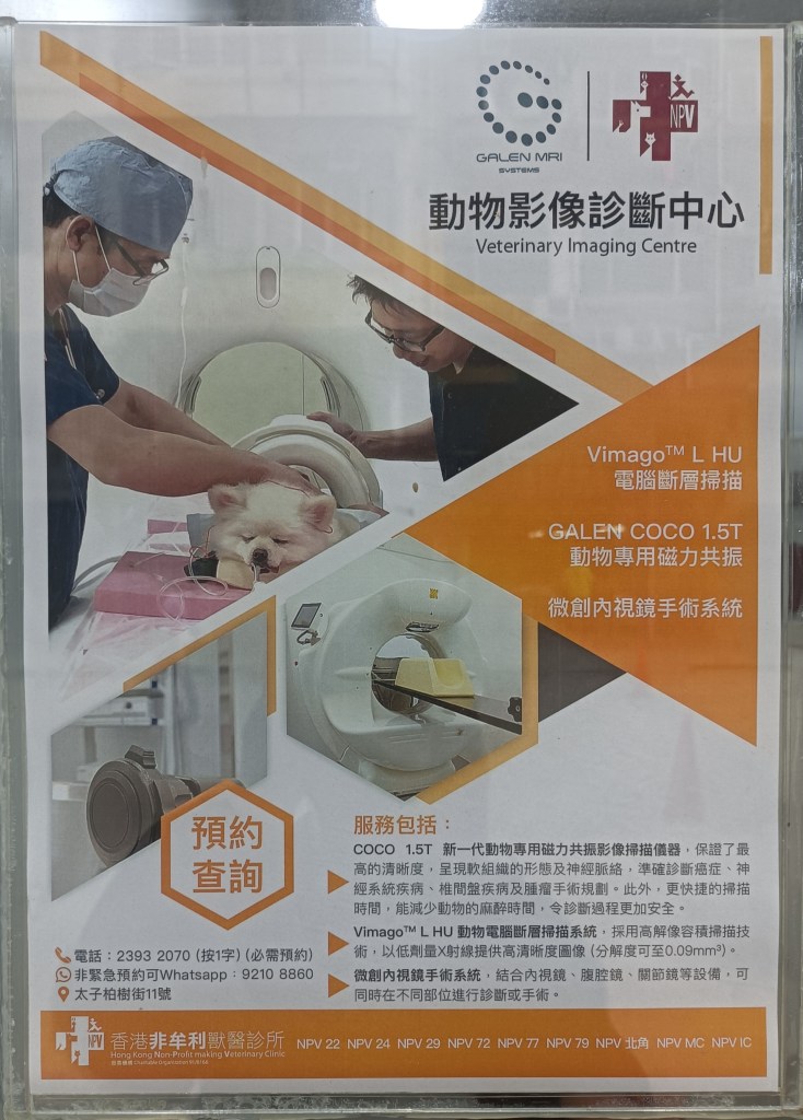 The veterinary imaging centre of the Hong Kong Non-Profit Making Veterinary Clinics, which is located in Cedar Street 11th, Sham Shui Po (left) and its service introduction poster (right)