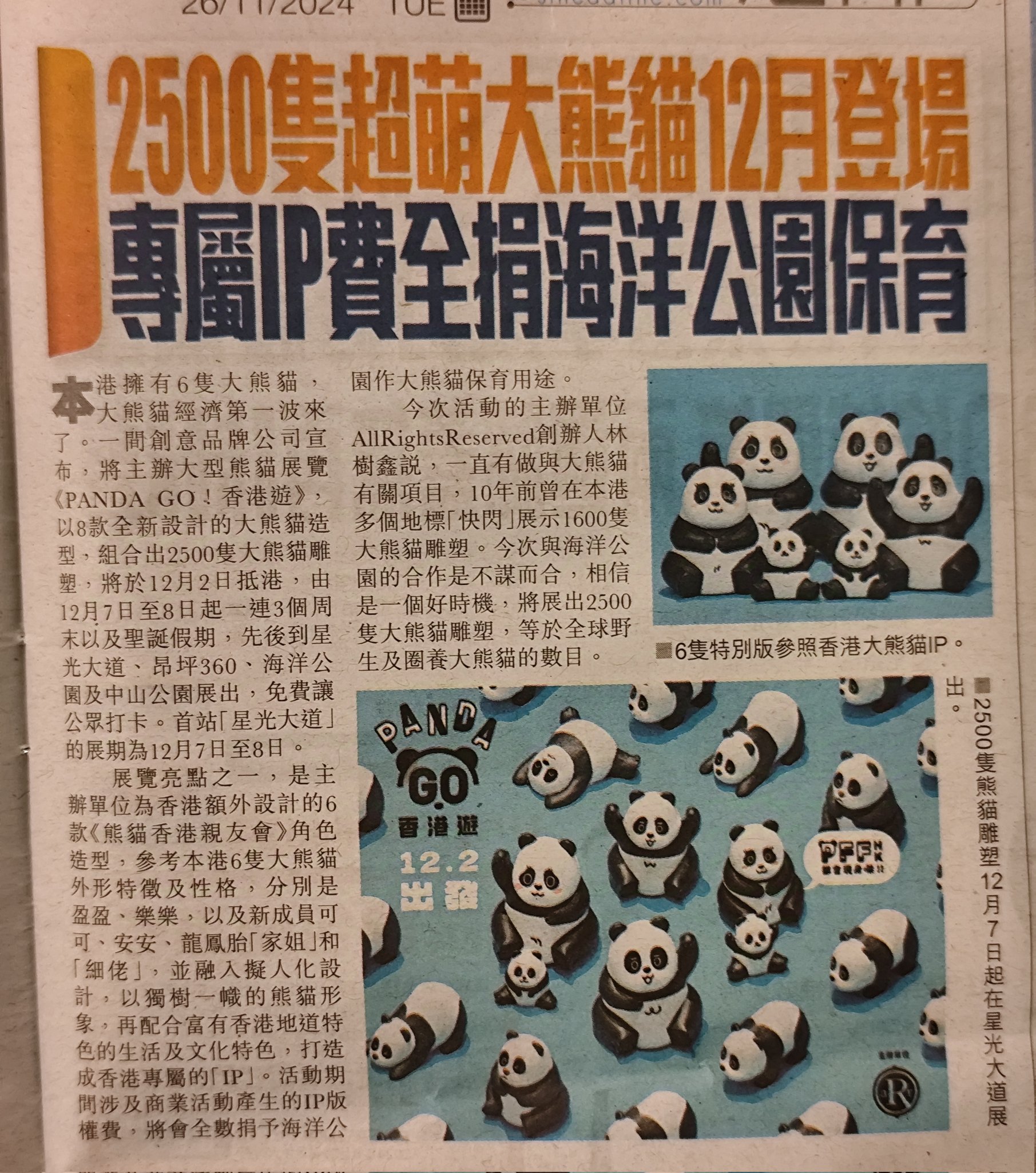 節錄自2024年11月26日出版的《頭條日報》Subscripted from《HK Headlines》is … 繼續閱讀 The visit of panda figures in Hong Kong during the"Panda Go! Fest HK" /「Panda Go! 香港遊」熊貓雕塑訪港記