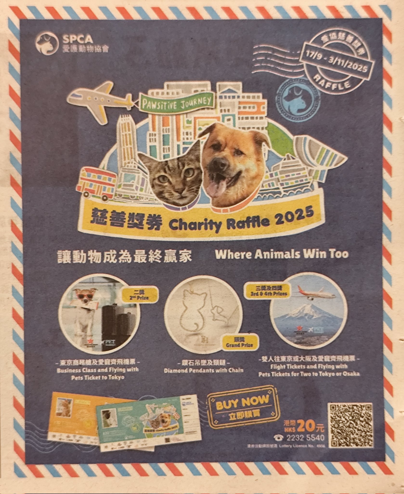愛護動物協會在2025年慈善獎劵義賣活動的廣告 (節錄自2025年9月26日出版的《頭條日報》)The ad … 繼續閱讀 The SPCA Hong Kong’s Raffle 2025 / 愛護動物協會慈善獎劵2025