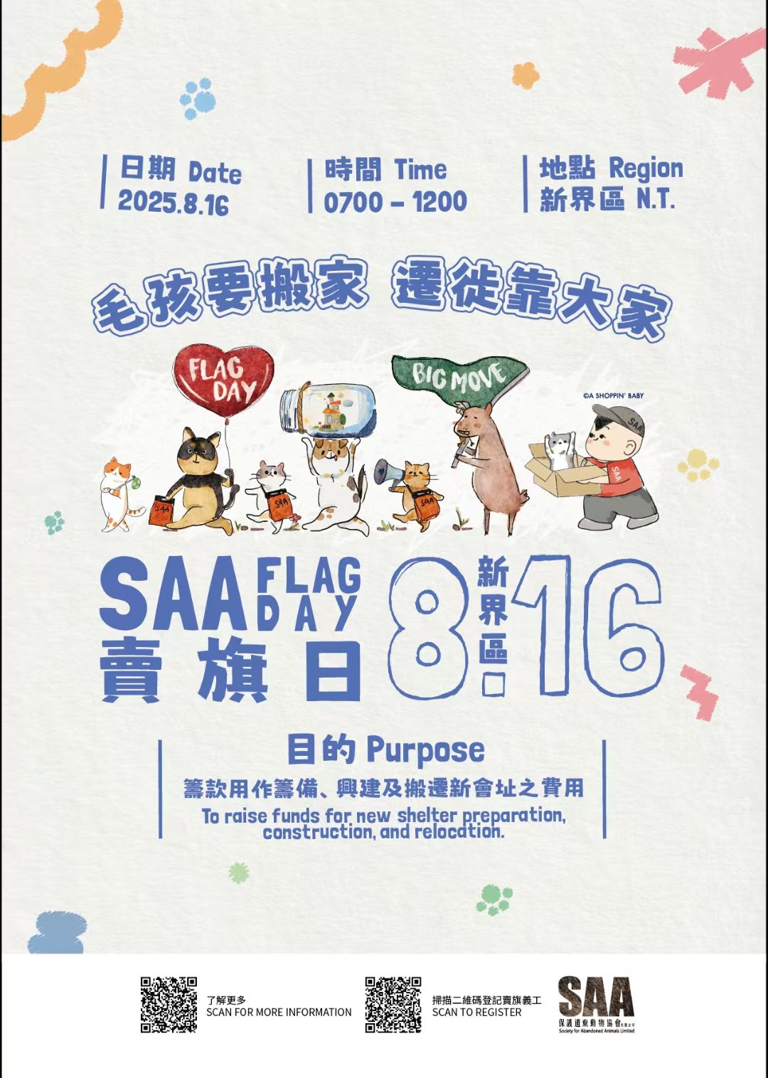 保護遺棄動物協會(SAA)在2025年8月於新界區賣旗籌款活動的宣傳海報The poster of the S … 繼續閱讀 The Society for Abandoned Animal’s (SAA) Flag Day at August 2025 / 保護遺棄動物協會賣旗籌款活動 (2025年8月)